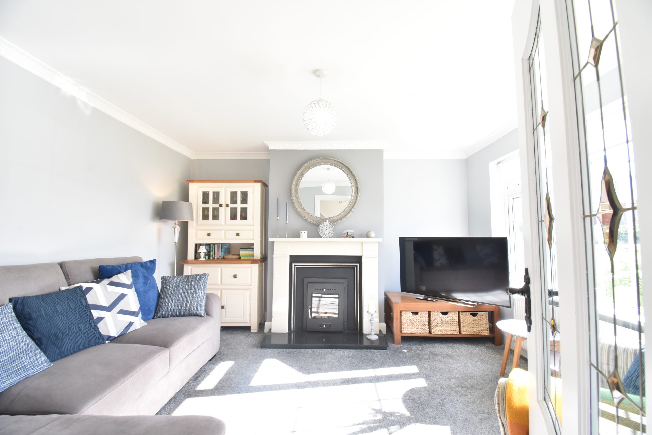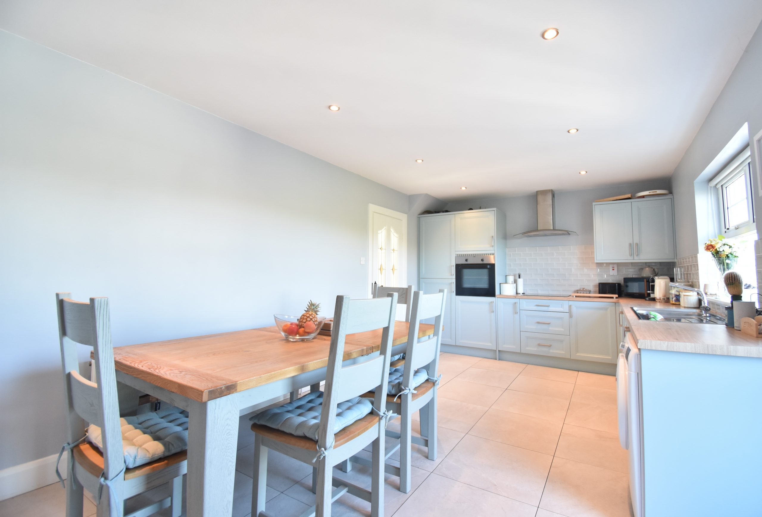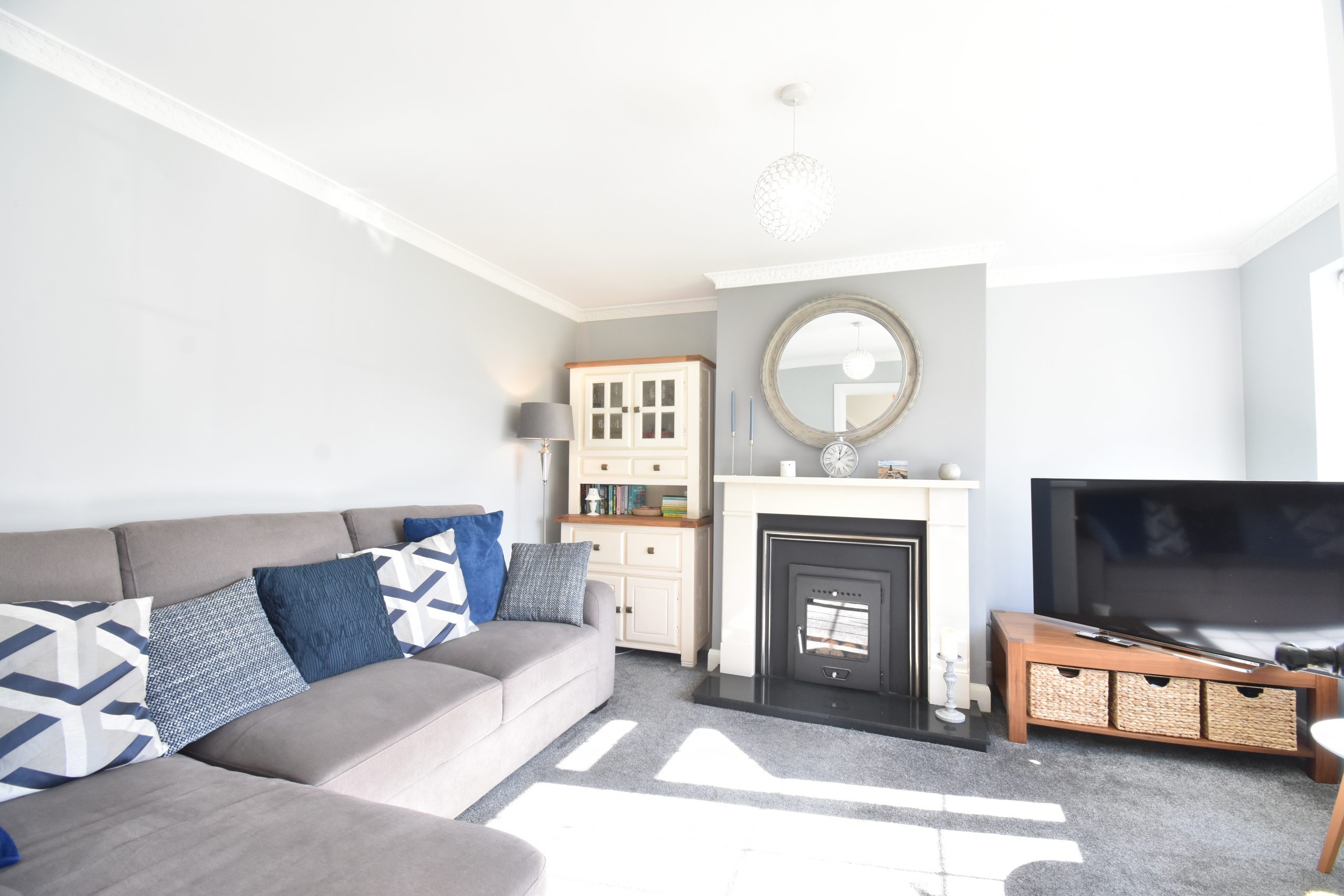The well-proportioned and well-presented interior briefly comprises; entrance porch with tiled floor, leading to entrance hallway with tiled flooring, carpeted staircase to first floor. Leads to main reception room also laid to carpeted flooring and open fireplace with marble surround and stove front.  The kitchen dining is a lovely bright space, crowned by a fabulous newly installed fully fitted kitchen in lovely duck egg blue colour with units at eye and waist level, tiled backsplash, tiled floor, complete with appliances.