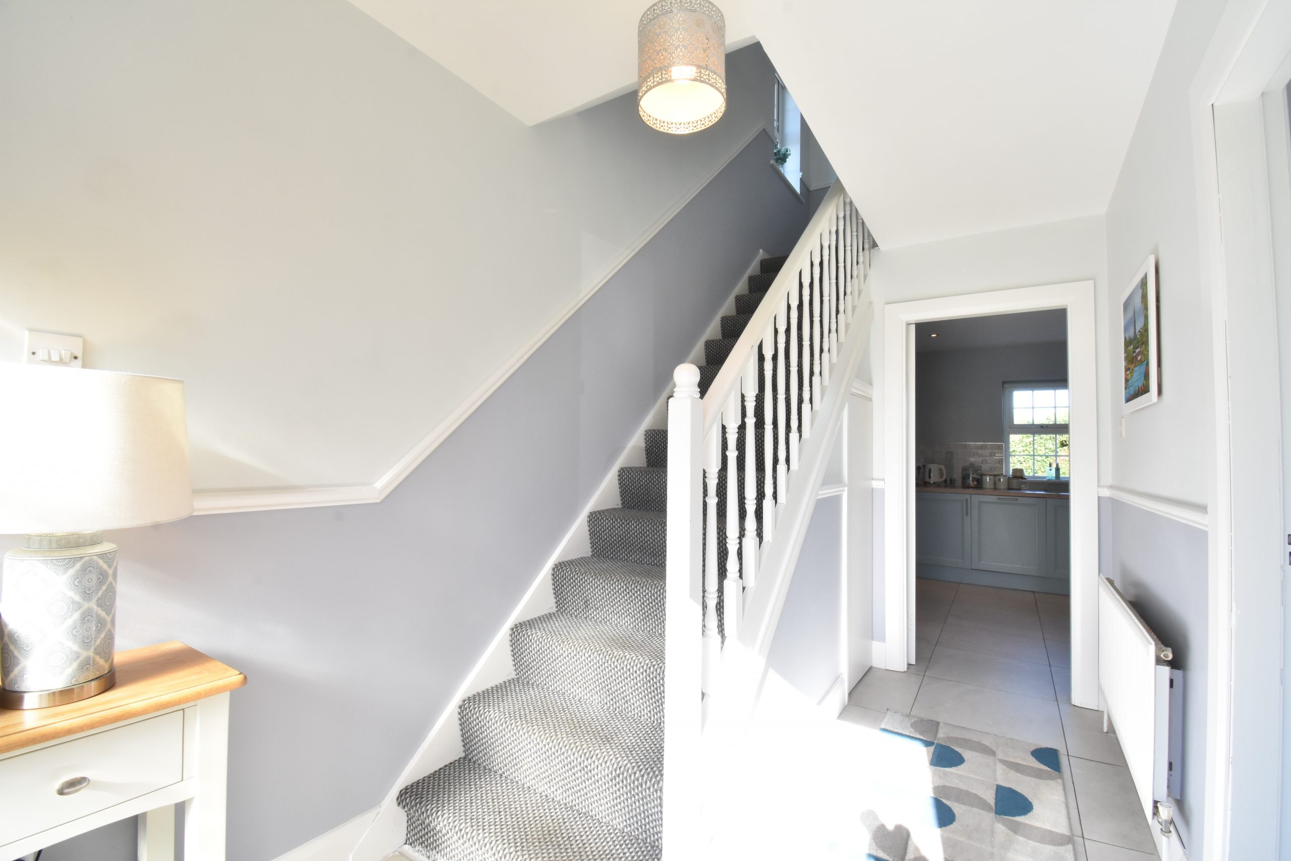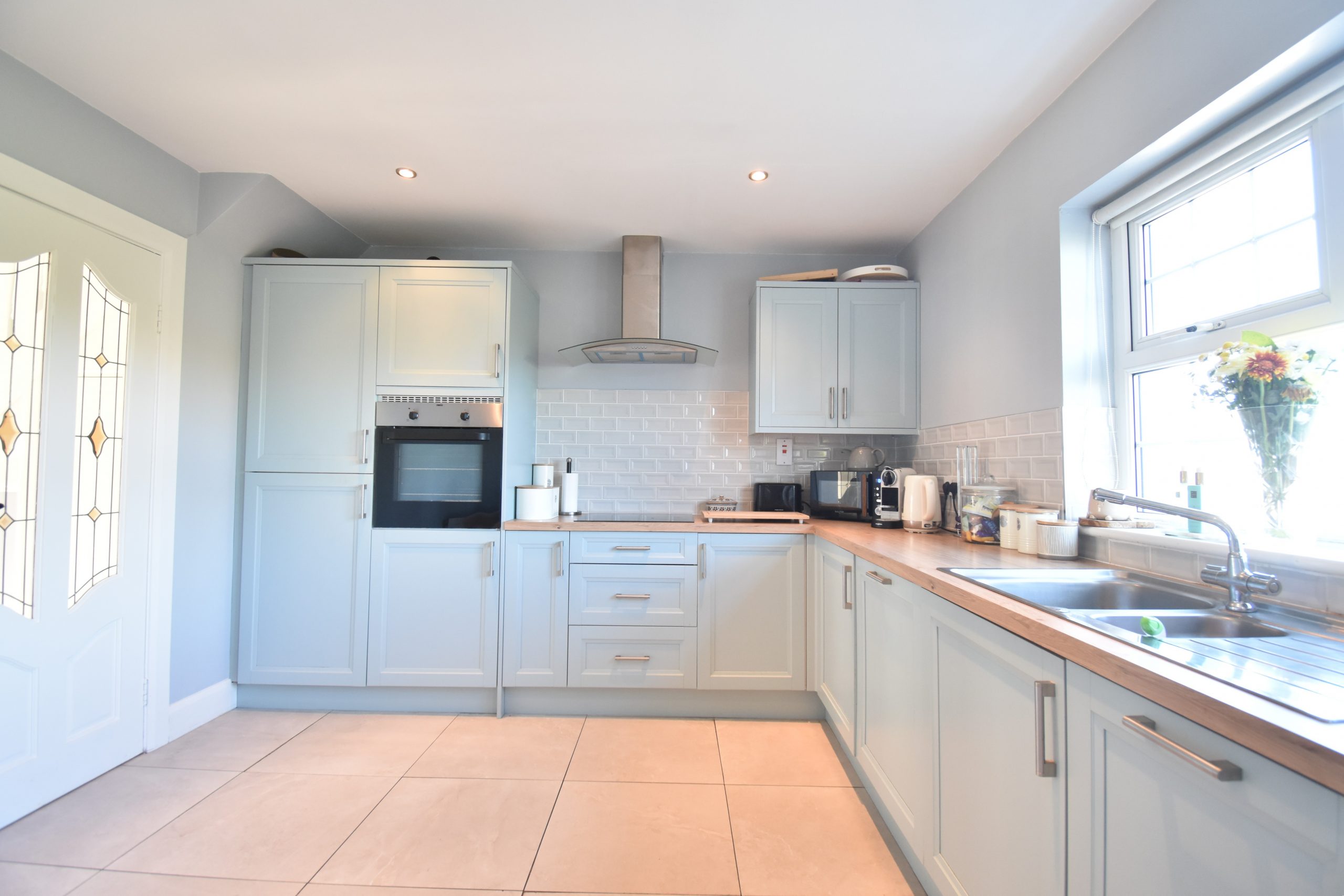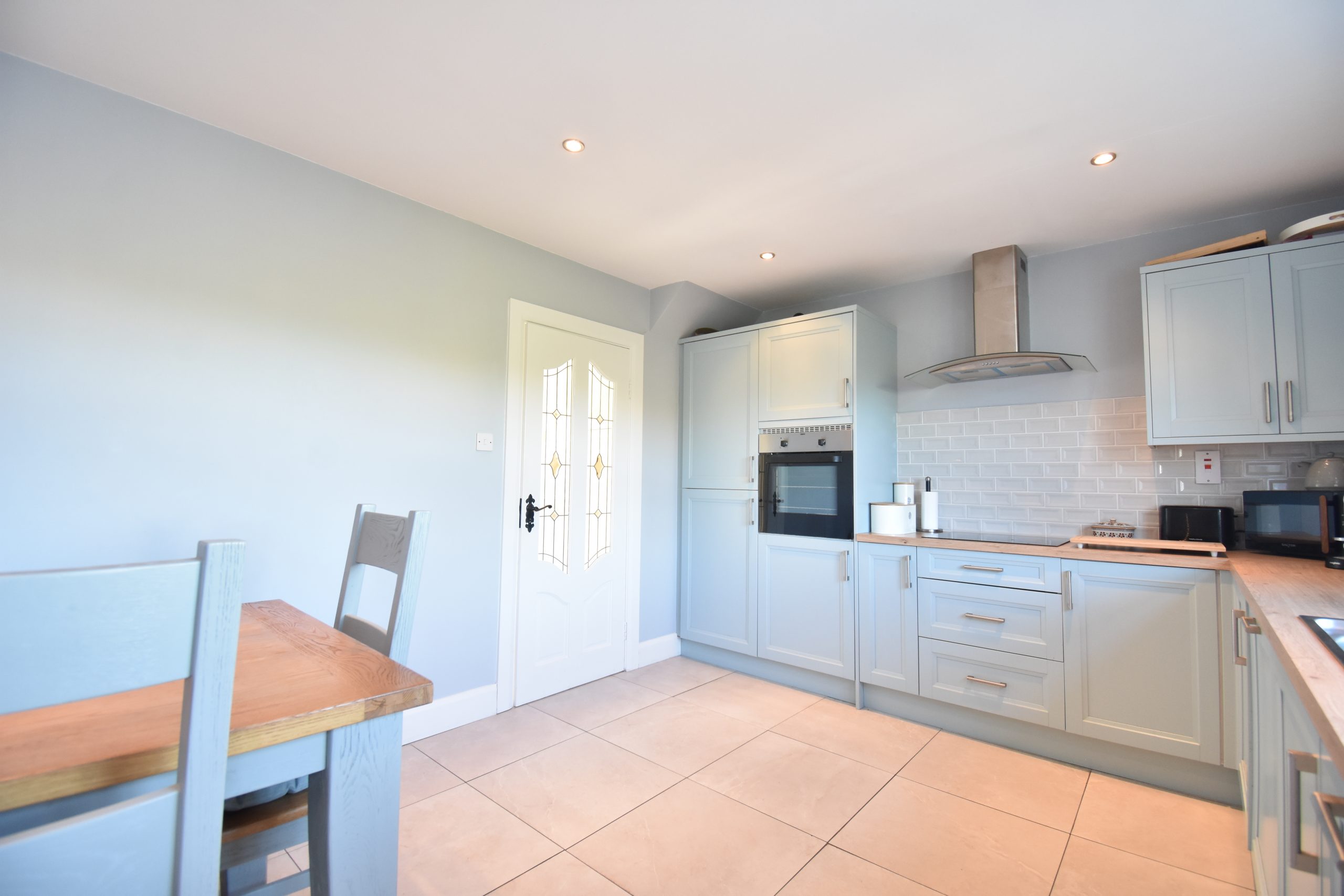 The well-proportioned and well-presented interior briefly comprises; entrance porch with tiled floor, leading to entrance hallway with tiled flooring, carpeted staircase to first floor. Leads to main reception room also laid to carpeted flooring and open fireplace with marble surround and stove front.  The kitchen dining is a lovely bright space, crowned by a fabulous newly installed fully fitted kitchen in lovely duck egg blue colour with units at eye and waist level, tiled backsplash, tiled floor, complete with appliances.
